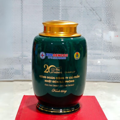 | Tên | Hũ đựng trà in logo kỷ niệm thành lập Công Đoàn công ty dáng trụ cao men xanh lá | Nguồn gốc xuất xứ | Gia Lâm – Bát Tràng – Hà Nội |